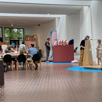 In de zomer van 2024 kreeg Mooss de unieke kans om, in het kader van de expo COME CLOSER, het Braempaviljoen in het Middelheimmuseum in te richten. Het resultaat was een bijzonder open atelier waar bezoekers op een speelse manier de tentoonstelling konden ontdekken en zelf aan de slag konden gaan. Kunnen we kunstenaar zijn wanneer we de tafel dekken, onze tanden poetsen of zwaaien naar de buren? Ben je nog jezelf wanneer je kunstenaar bent, of ervaar, voel en denk je op een andere manier?